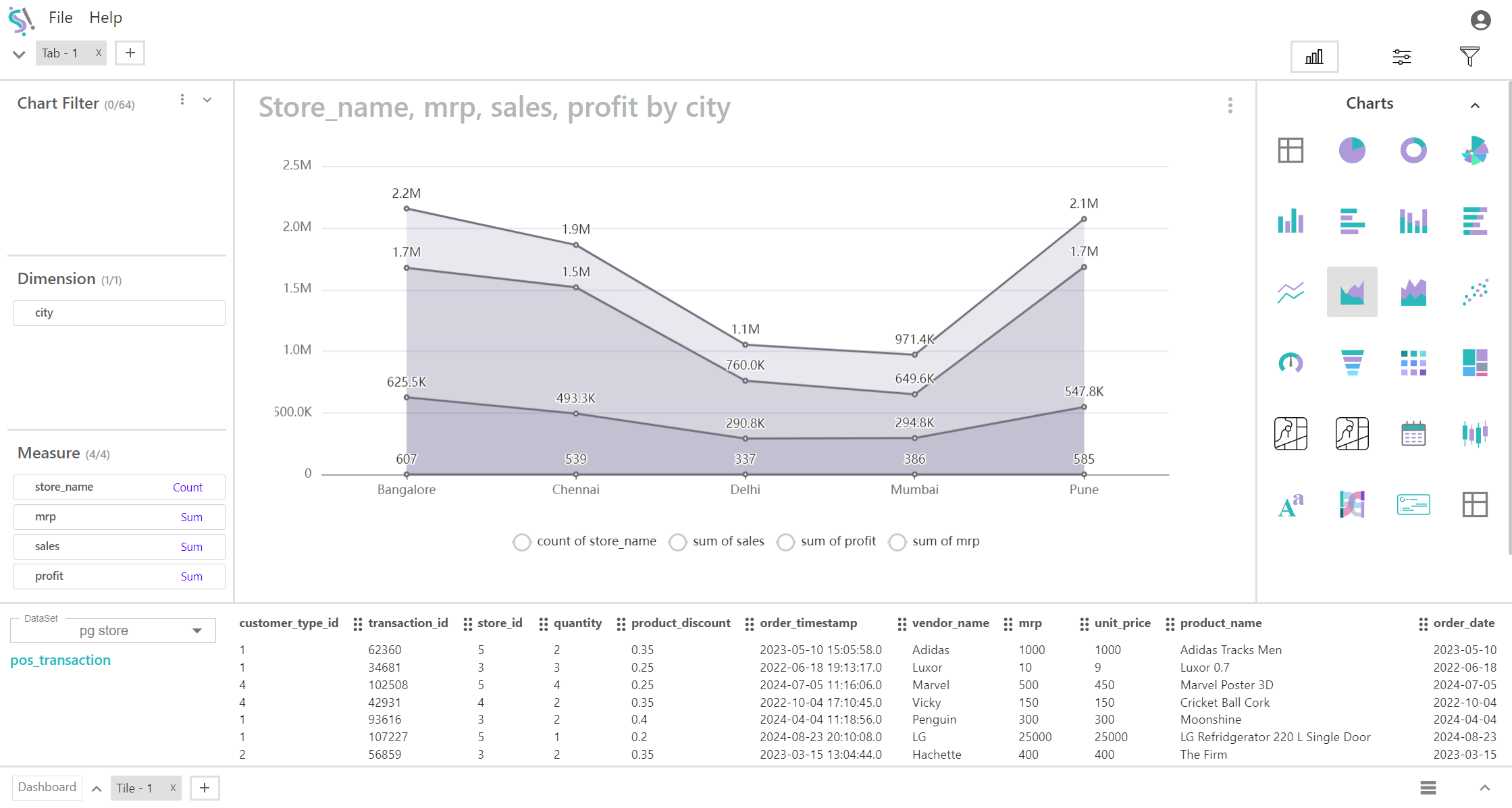 An area chart is a type of graph that displays quantitative data over time or another continuous variable, where the area beneath the line is filled with color. It is used to show the magnitude of values and to illustrate changes in the data over time or across categories. Here’s a detailed overview of area charts: